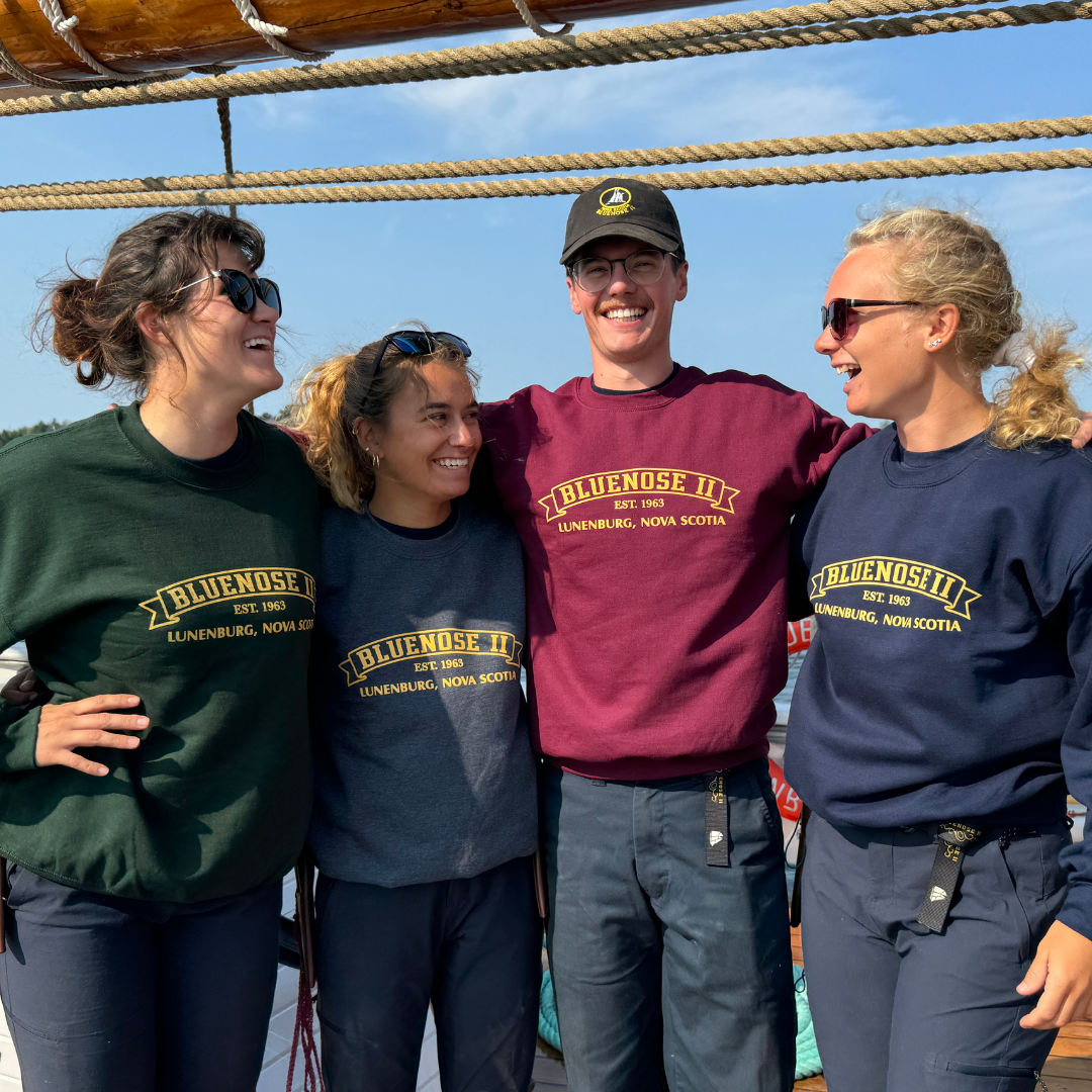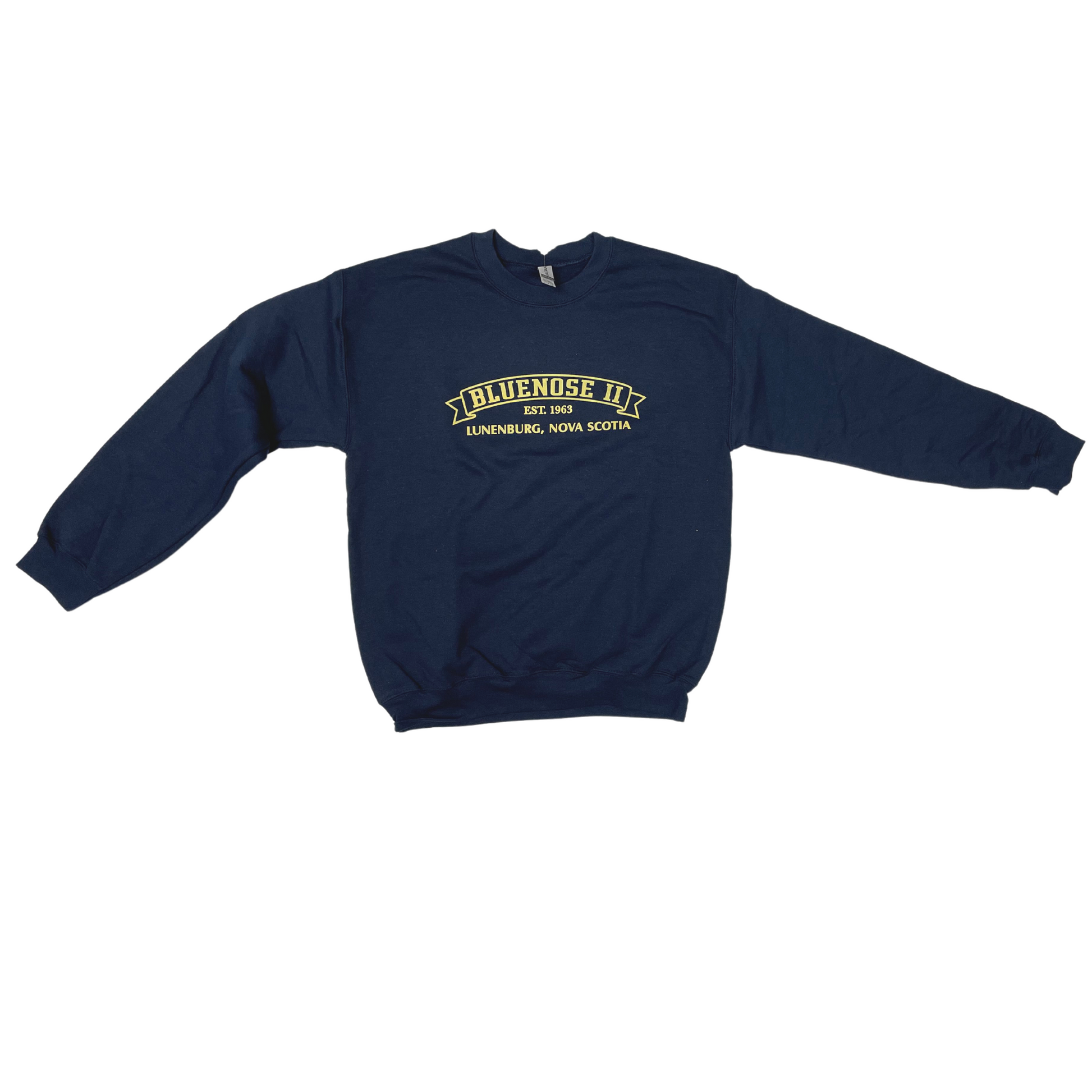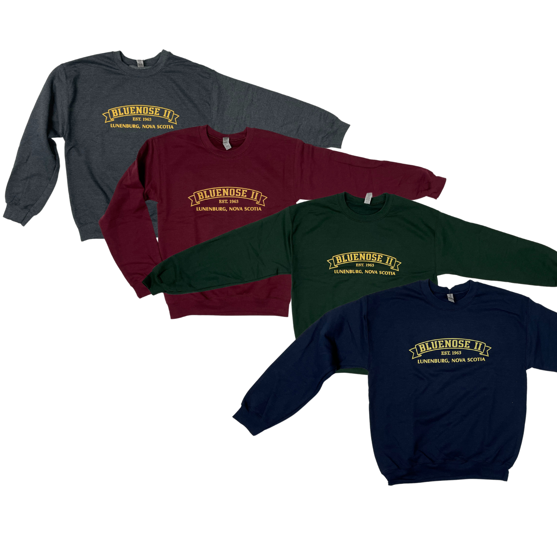 Our Bluenose II Banner Crew Neck Sweater is a 50/50 poly-cotton blend and is available in navy, forest green, burgundy and heather grey. They are a standard, unisex fit - Perfect for all!
