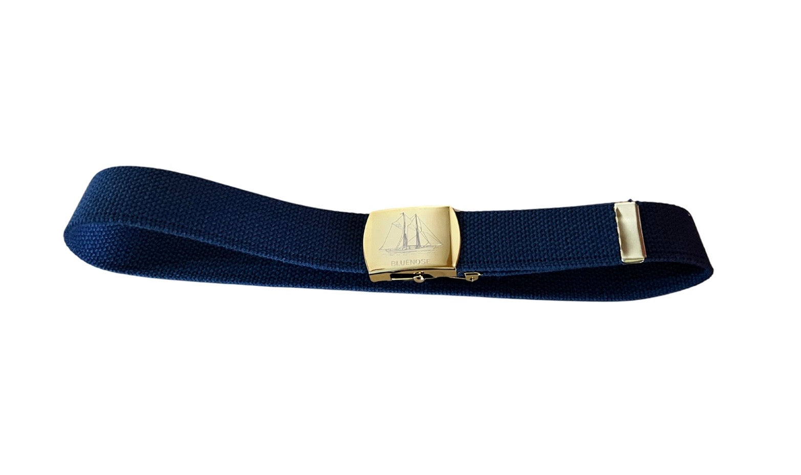 Our custom Bluenose belt features an engraved brass plated buckle on navy canvas webbing. The belt can be cut to fit and is available in the following sizes: