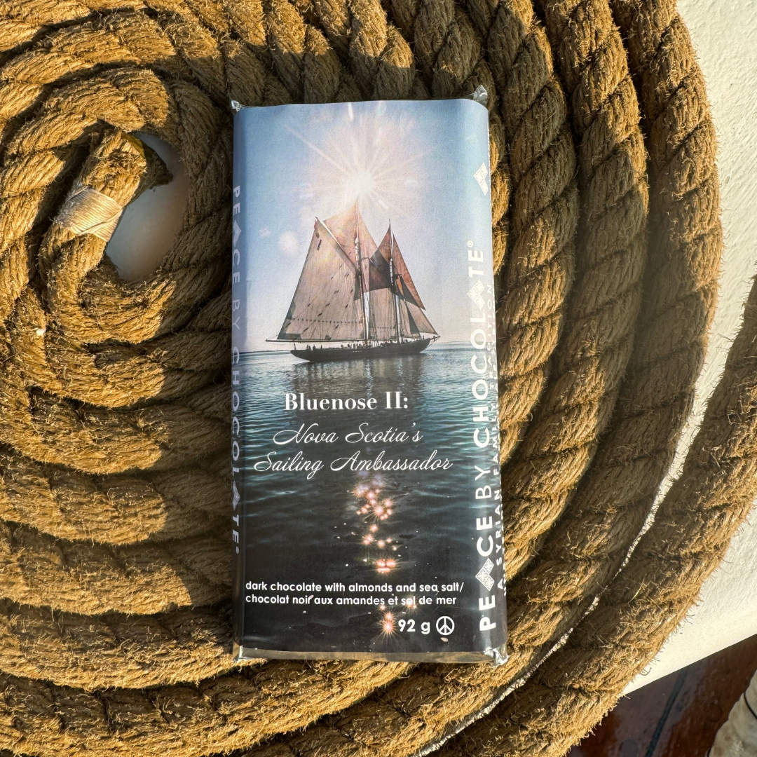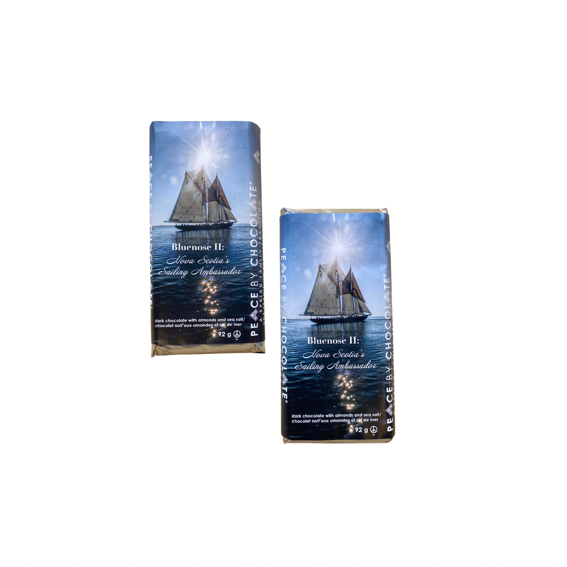 We have partnered with Peace by Chocolate to bring you this custom chocolate bar, sold exclusively at the Bluenose II Company Store. The Bluenose II Bar is a combination of decadent dark chocolate, almonds and sea salt; It's a 92-gram bar that's perfect for sharing, gifting or keeping for yourself!