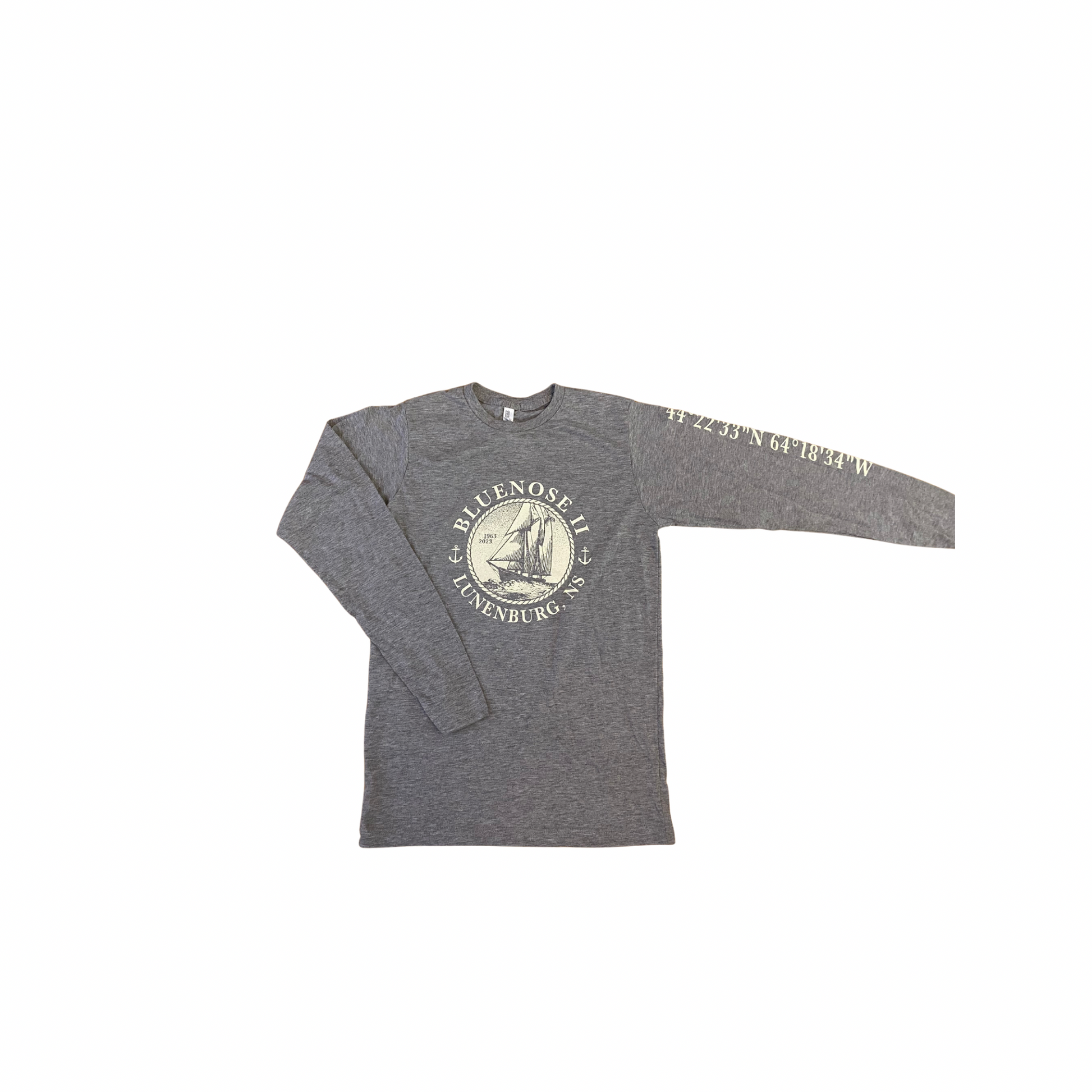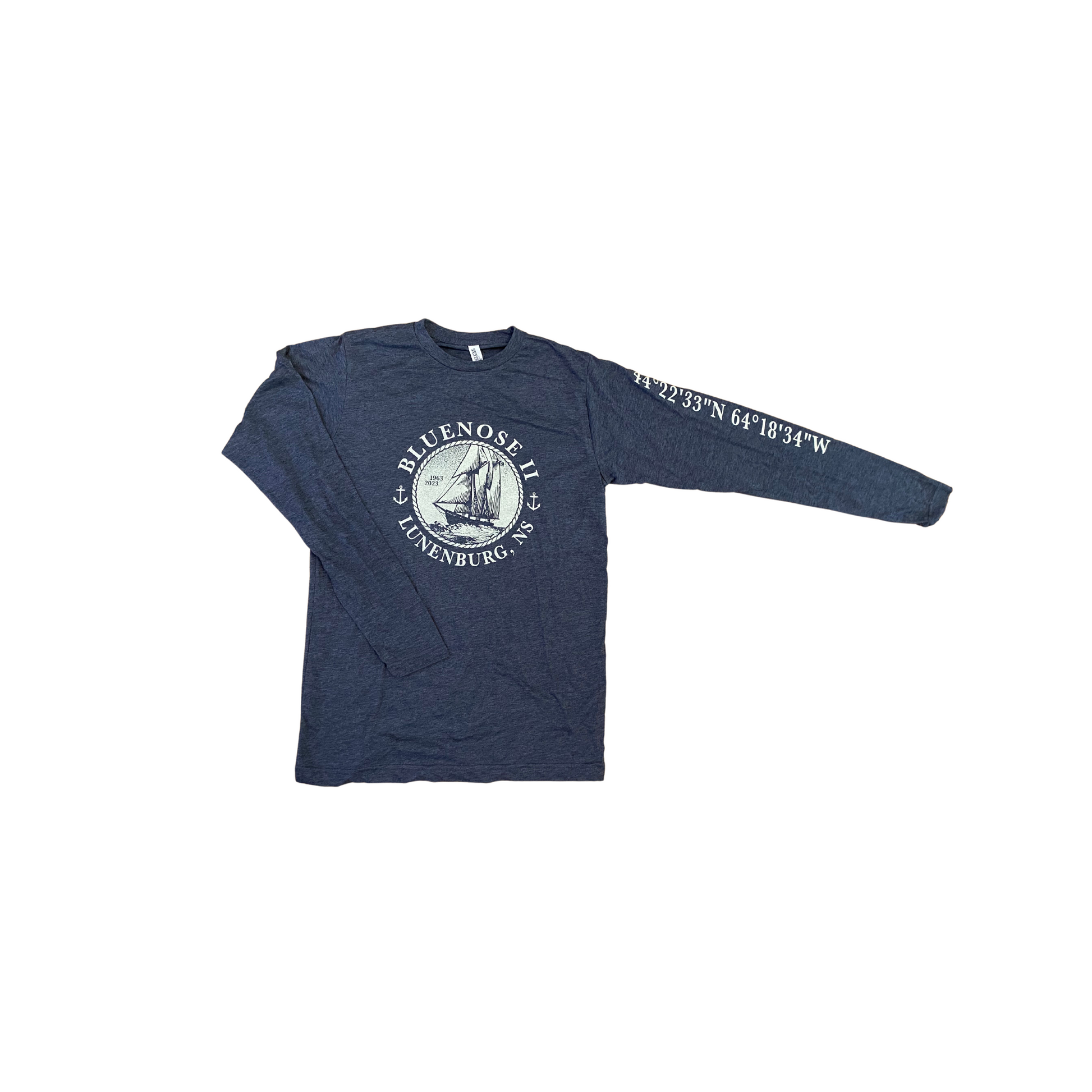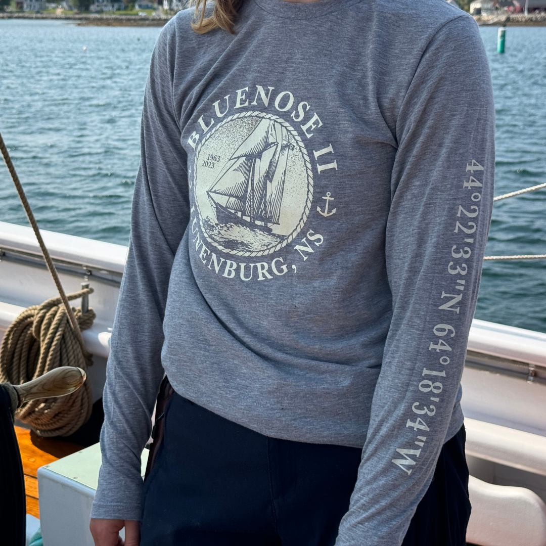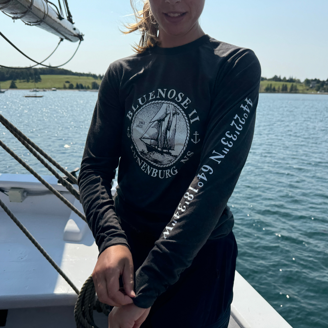 Our Rope Circle design has a vintage look and feel that both landlubbers and sailors can appreciate! This design incorporates the coordinates for the town of Lunenburg, featured on the left sleeve.